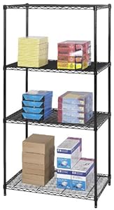 | Starter Shelving Unit,4 Shelves/4 Posts,36 quot;x24 quot;,Black | | Access the most advanced RSS tools and use them to your advantage. | 2013-03-23 05:13:34.861413-04 Category: Home & Kitchen Vendor: UPC: 0073555528831 Country of Origin: CN Dimensions: 36"w x 24"d x 72"h Material: Steel Color: Metallic Gray  Product Description : Greenguard Indoor Air Quality Certified Includes 4 shelves, 4 posts and snap-together clips Strong welded wire construction with a per shelf capacity of 1000 lbs (with weight evenly distributed) Overall Capacity: 2500 lbs. (evenly distributed) Open wire design permits air circulation and prevents dust accumulation Shelves adjust in 1'' increments Unit assembles in minutes without tools Optional Add-On Unit and Extra Shelf Pack available to meet specific requirements Available in black or metallic gray powder coat finish Backed by manufacturer's Limited Lifetime Warranty Find out more | |